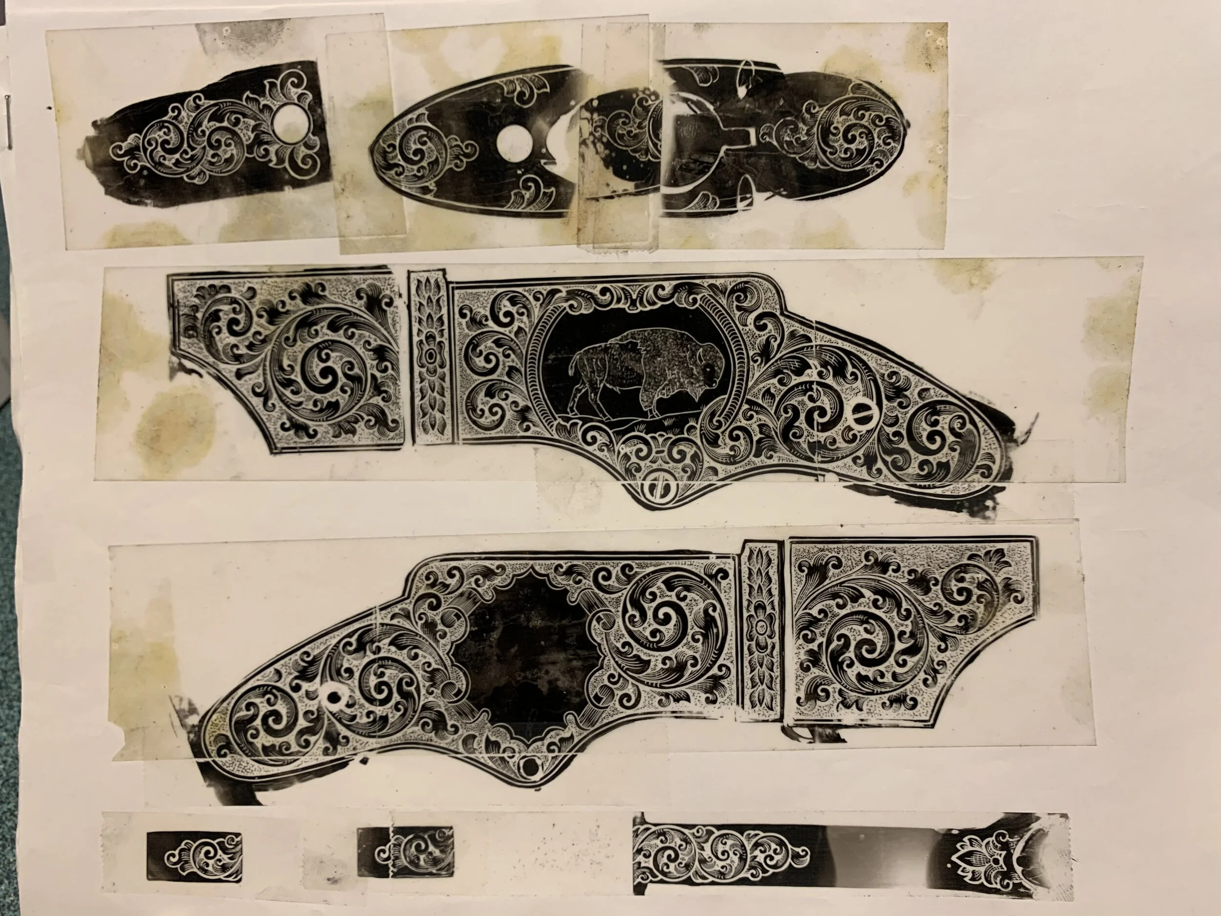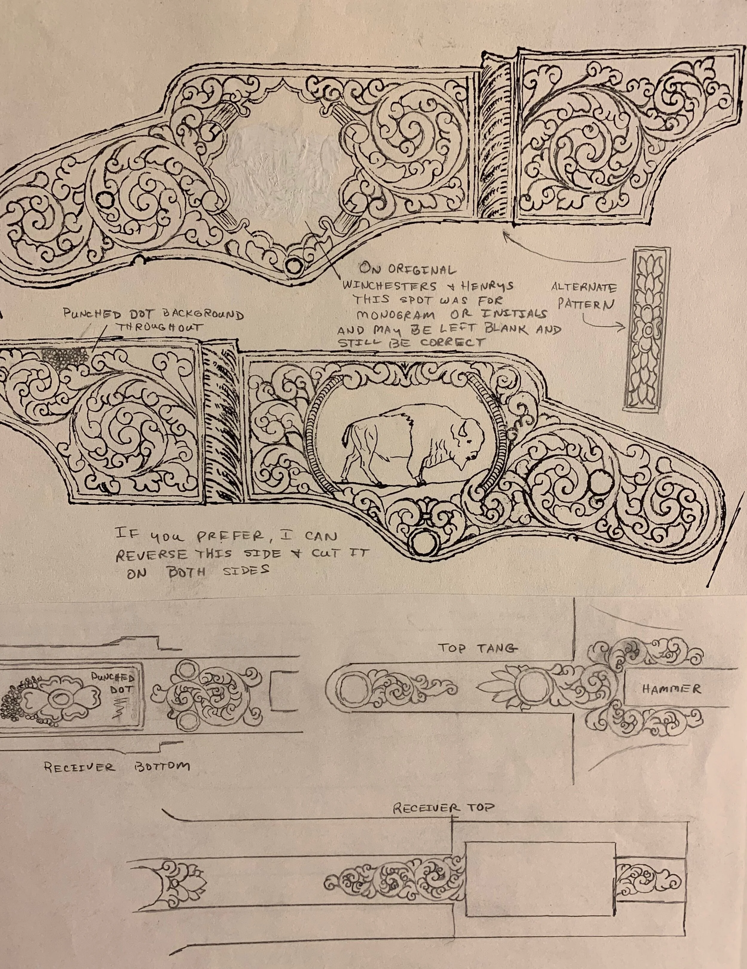 Looking at my pattern book revealed a smoking I’d taken of the finished job, and the drawings I’d made with notations. It also proved without a doubt his gun was the same as the smoked one, as the details of his photos matched it exactly. No two engravings could ever be that perfectly alike if cut by hand, no matter how good the engraver (I have a book that shows how microscopic details of engravings can prove the identity of the engraver).