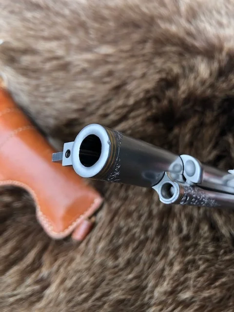He had rigged up an inexpensive nylon cordura holster on his pack frame belt. This gave him easy, comfortable access if it was needed. We stopped to take a break, and when he sat down, he unbuckled the pack belt to stand up and stretch a bit. The holster we rigged up was too short for the gun, so the muzzle projected past its end. He’d forgotten its exposure, and when it dropped down to the ground, the muzzle struck a jagged rock, putting a nice big ding on it. Such a howl he set up! I, of course, didn’t feel a bit compassionate and found it humorous (dings such as that are a part of life). Once we returned home, I was able to reduce the damage some, but since the gold bands were so close, there was only so much to be done. We still laugh about it when he carries it!