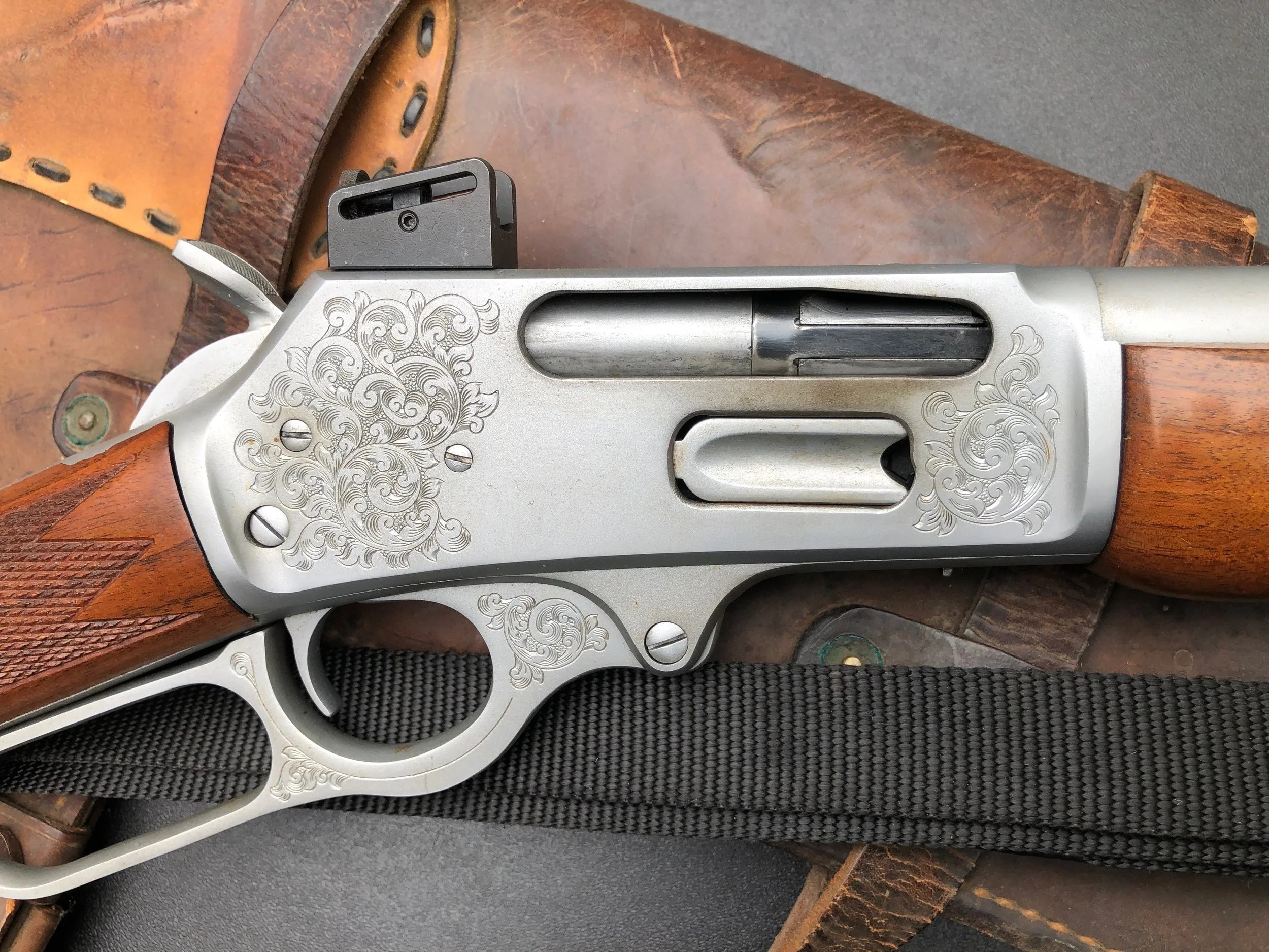 I purchased my first .444 Marlin rifle back in the 80s when I worked at Shooters Supply in Hutchinson, KS. The one I’m going to tell you about now I acquired while here in Alaska. This one shows I’m absolutely unafraid to hunt with an engraved gun.